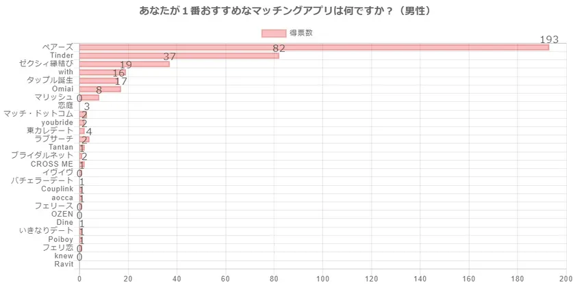1番利用されているマッチングアプリ、1番おすすめなマッチングアプリともに「ペアーズ」が1位となった。