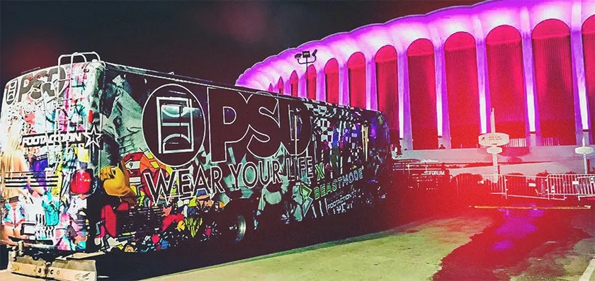 2人は仕事を辞め、中古のRV(リクリエーション・ヴィークル)を購入し、車両を磨いてロゴをペイントしました。そしてPSDブランドを広める為にRVに乗って旅に出たのです。翌年、自動車ショーやスポーツイベント、フェスなどいくつものイベントにRVで乗付け、精力的にPSDの宣伝を行いました。そして彼らは最初のインフルエンサーとしてアメリカンフットボール選手、スティーヴィー・ジョンソンに連絡を取りました。当時バッファロー・ビルズでプレーしていたジョンソンは、2人から連絡があった次の試合でタッチダウンを決め、シャツをまくった瞬間にPSDのロゴが全米のテレビの全面に映ったのです。その模様は アメリカの大手メディア、ESPNとSports Illustratedによって大きく取り上げられました。これによりPSDは本格的に始動したのです。