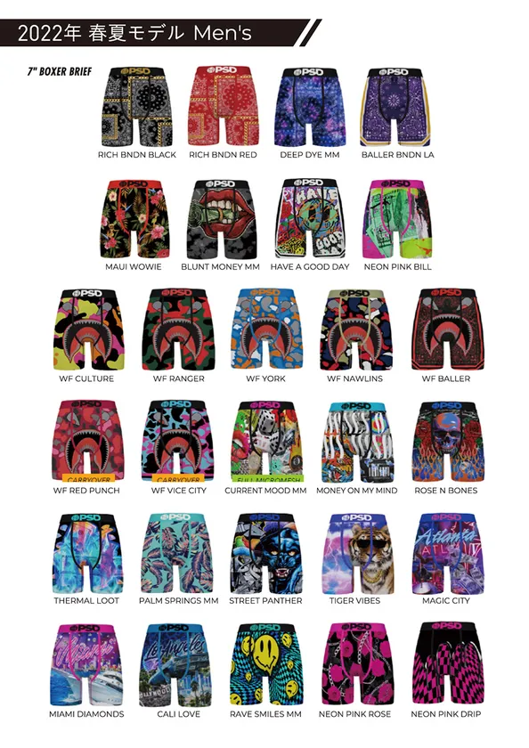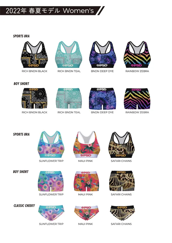 PSDは、通気性、清涼感、ストレッチ性に優れ、ホールド感があるのに着用感を感じさせない設計。軽くて肌ざわりが良いのでスポーツウエアやルームウエアとしても快適に着用できます。また、バンダナ柄やレオパード柄、カモフラージュ柄などをモチーフに圧倒的な存在感のカラーリングは周囲を魅了します。