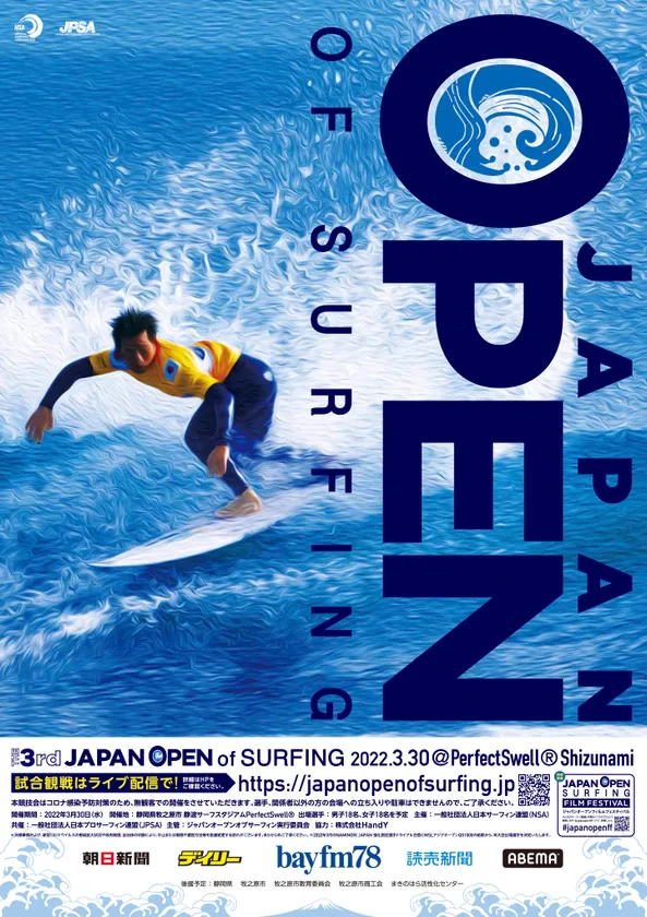 ジャパンオープンオブサーフィン実行委員会(事務局:東京都新宿区、一般社団法人日本サーフィン連盟)は本日の記者会見にて、サーフィンの日本一を決める祭典「第3回ジャパンオープンオブサーフィン」の開催を発表しました。日本初の大型サーフィンプール「静波サーフスタジアムPerfectSwell(R)」にて無観客試合とし、2022年3月30日(水)に開催いたします。また、試合の様子はABEMAにて、セミファイナルとファイナルが生中継されます。