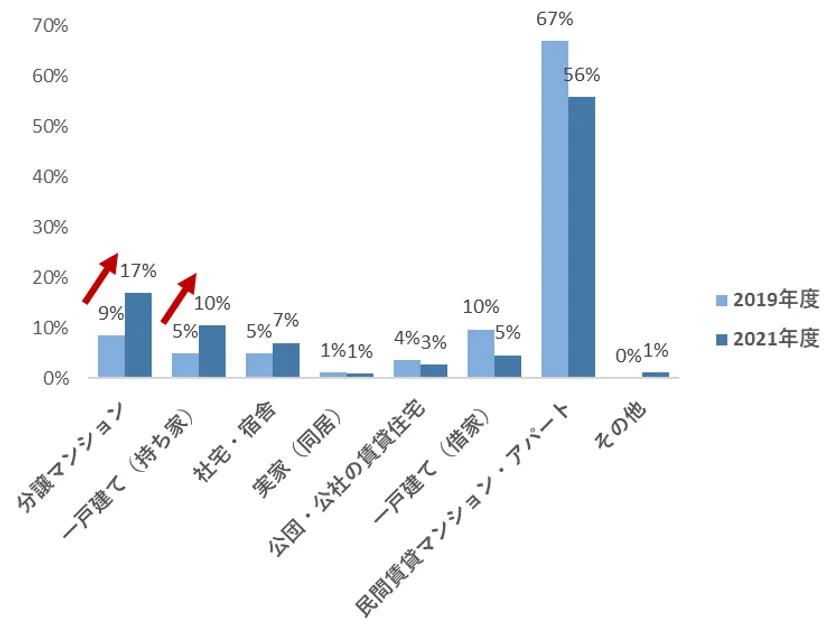 上記のように、新型コロナウイルス感染拡大前の2019年と2021年を比較するとお問い合わせ頂いた方の現在のお住まいが、持ち家(一戸建て・分譲マンション)と回答した数は合計で14%から27%へと倍増しています。