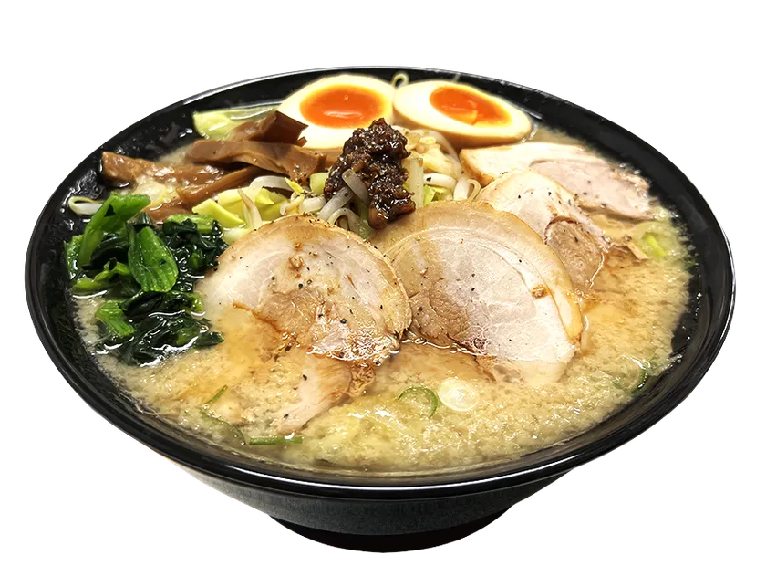 具材は、とろ~り半熟味玉、チャーシュー、メンマと、“秘伝の漬け込みダレ”に加え、キャベツ、ほうれん草、もやし、ネギなどの野菜を豪快に盛り付け。