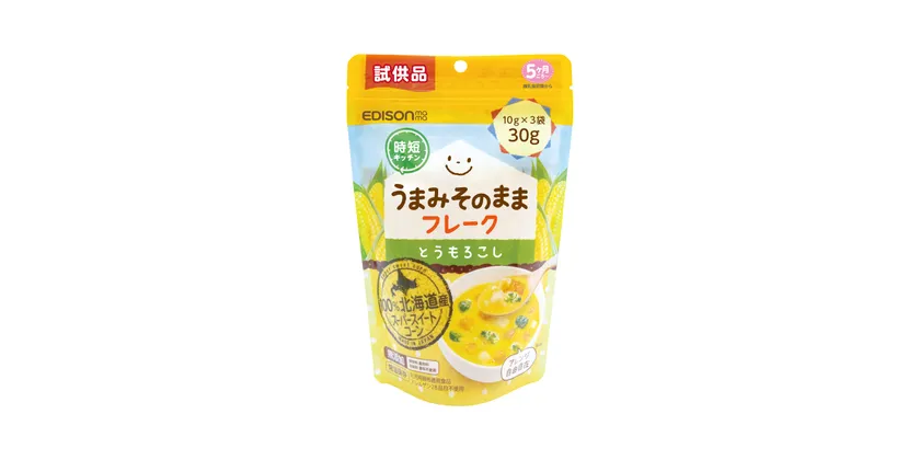 まるでとれたてのような甘さ!100%北海道産のとうもろこしのみ使用したフレーク。きめ細やかなフレークはパウダータイプよりもサッと溶けるので、お湯はもちろん水でも簡単に調理できます。