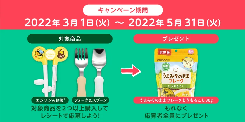 「エジソンのお箸(R)」または「フォーク&スプーン」(ステンレス製※ケース付き含む)を2つ以上購入したレシートを指定の応募方法(WEB/郵送)で申し込むだけ。ご応募いただいた全員にもれなく「うまみそのままフレーク とうもろこし30g」が当たる!