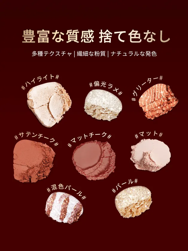 アイシャドウはマットなものからシマーなものまで入っており、チークとハイライターはどんな肌色も引き立てる明るい色合いが揃っています。パウダーはシルクのようになめらかで、ピグメントが均一につき、軽いので重ね塗りしてもキレイになじみます。