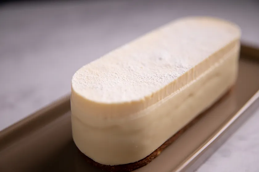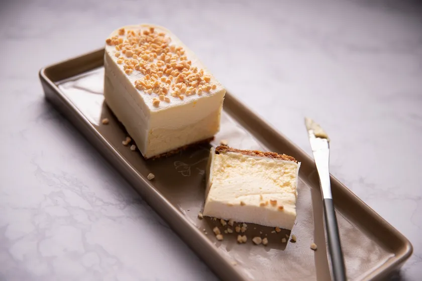 素材集めから改めて行った、これまでのチーズケーキとは全く異なる「北海道チーズのチーズテリーヌ」は、その名の通り北海道産のチーズを100%使用しております。沢山のチーズの中から選び抜いたこの北海道産クリームチーズを使い、火入れの方法を試行錯誤する中で、独自のとろっと絶妙な食感を実現しました。また側面にコーティングしたホワイトチョコレートによって、チーズの爽やかな味わいの中にホッとする甘さが同時に広がります。さらに底面には固めのクッキー生地を敷き、濃厚なチーズでもしつこさを感じず食べ進めていただくことができるよう工夫を凝らしています。最後の仕上げはお客様ご自身で、別添のローストしたクラッシュアーモンドを振りかけていただくことで、ほろほろとした食感のアクセントもお楽しみいただけます。爽やかな味わいとチーズ、ホワイトチョコレートの真っ白な美しいフォルムが特徴のテリーヌタイプのチーズケーキです。