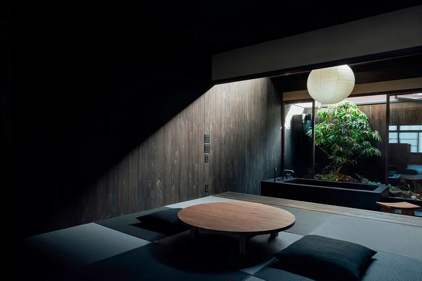 大型の京町家2棟を改修した、全7室のラグジュアリーな旅館です。客室ごとに異なるインテリアは「和菓子」をテーマにしたもの。高い天井に走る梁、美しく装飾された建具など、かつて材木屋として使われていた頃の名残を随所に残しています。