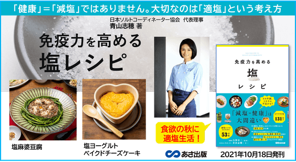 株式会社あさ出版(代表取締役:佐藤和夫、所在地:東京都豊島区)では、ソルトコーディネーター 青山志穂 著『免疫力を高める 塩レシピ』を2021年10月18日(月)に刊行いたします。