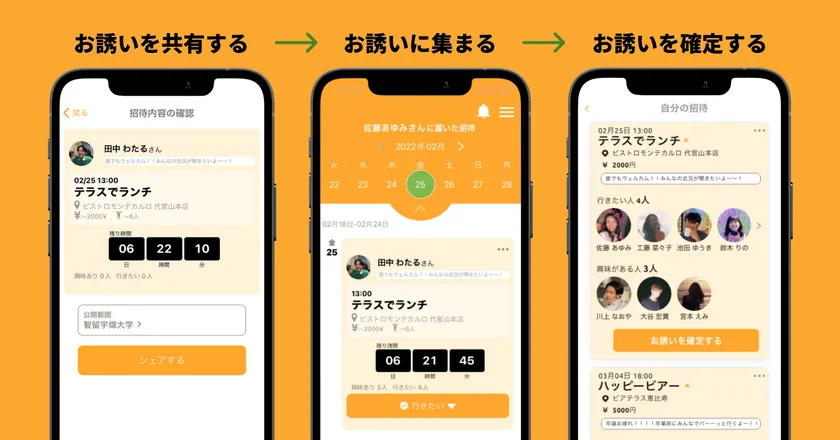 アプリ内で遊びのお誘いを作成し、それを公開したい友達のタイムライン上で共有すると、お誘いを受け取ったユーザーは興味を持った遊びのお誘いにアプリ内の「行きたい」ボタンで意思表示するだけで、遊びの約束を交わすことができます。