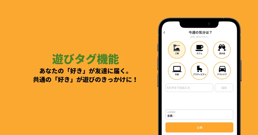「遊びタグ機能」では「ご飯」や「アウトドア」といった自分のやりたいことを登録するだけで、友達に自分の「遊びの嗜好」を共有することができます。