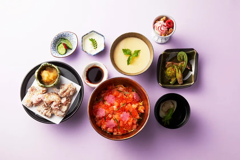 春の花が生けられたホテル館内でもお花見をお楽しみいただけます。春のランチにおすすめの「お花見御膳」は食でもお花見を味わえます。花の咲いたような、ちらし寿司にはサーモン、イクラ、 玉子、胡瓜が入り、菜の花のお吸い物や桜のパンナコッタと旬を味わっていただけます。