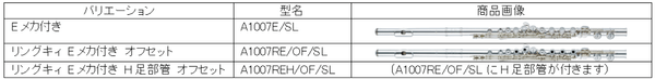 「A1007/SL シリーズ」は暖かく力強い鳴りが魅力で、幅広い音楽シーンに対応。趣味の室内楽で演奏される方や、大編成の合奏でもしっかりと音を主張させたい吹奏楽部の中高生など、様々な方にフルート演奏を心から楽しんでいただけるモデルです。カバードキィタイプの『A1007E/SL』のほか、リングキィタイプでオフセットの『A1007RE/OF/SL』 、A1007RE/OF/SLにH足部管を採用した『A1007REH/OF/SL』 の3種をラインアップしています。