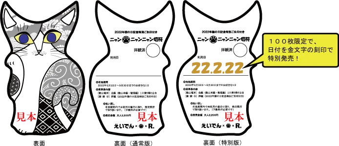 8.そ の 他 2022年2月22日(火)に限り、先着100枚限定で日付を金文字の刻印で特別発売します。なお、ご利用日は2月22日となりますのでご了承ください。