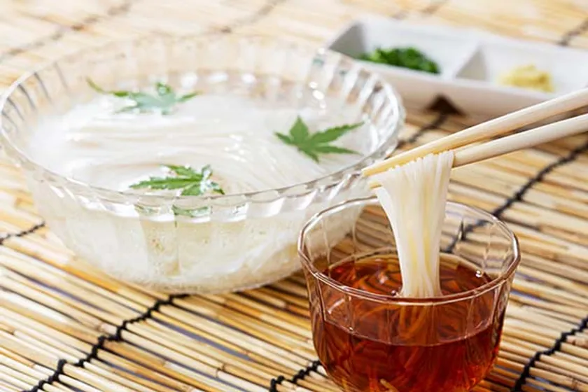 減塩と感じさせない最大のポイントは「だし」の相乗効果にあります。減塩つゆにはそうだかつお削り節と椎茸粉から丁寧に抽出しただしを入れています。そうだかつお削り節の旨み成分であるイノシン酸と椎茸粉の旨み成分であるグアニル酸、そしてつゆに多く使われているしょうゆの代表的旨み成分であるグルタミン酸の間には相乗効果があることがわかっています。だしの効果を発揮するにはそのバランスも重要であり、減塩つゆは最も「旨い!」と感じる配合率を採用しています。