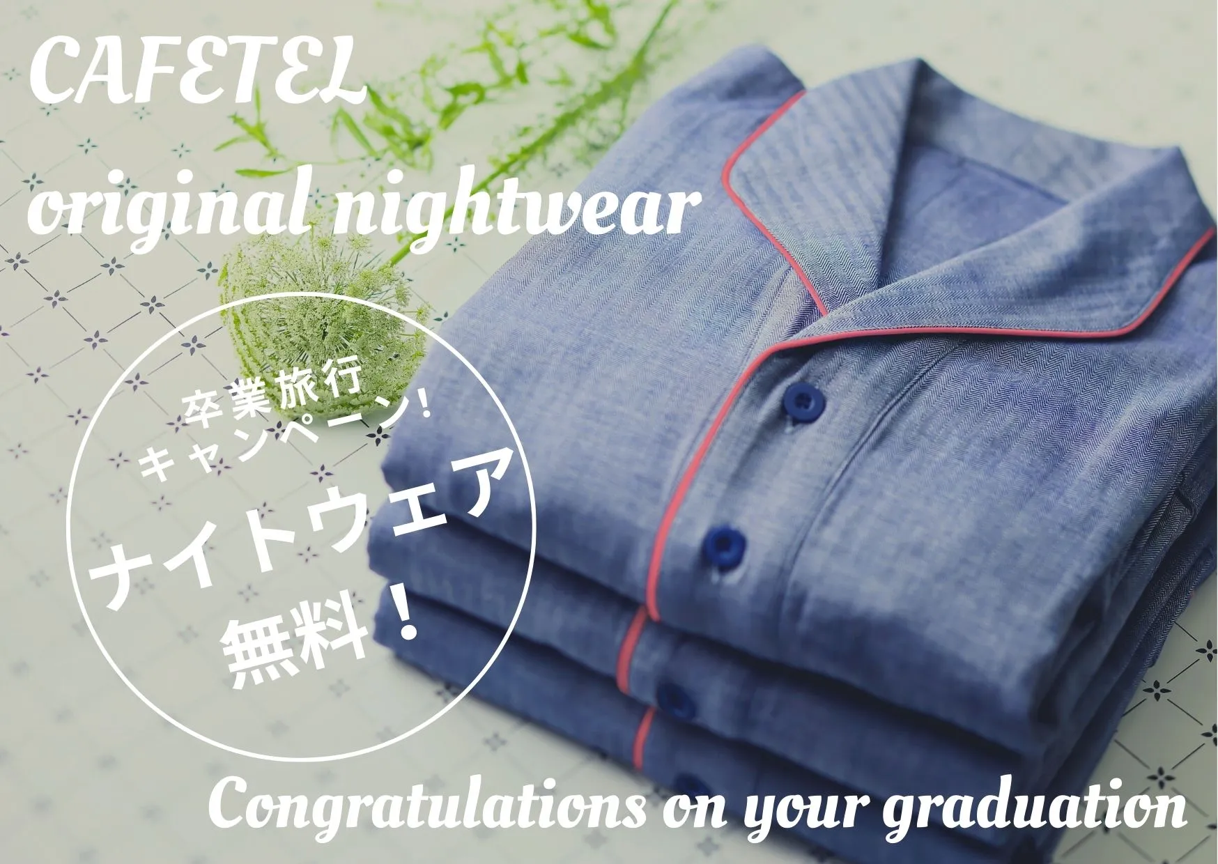 卒業生の皆様、ご卒業おめでとうございます。これから新たなステージへ進むあなたへ、CAFETELからささやかなお祝いをお送りします。2022年卒業(予定)の方を対象に、通常レンタル200円のナイトウェアを無料で貸し出しいたします。ワンピース型のCAFETELオリジナルナイトウェアはお泊りを盛り上げてくれること間違いなし!大切なあの子との卒業旅行は、CAFETELで一生忘れられない素敵な思い出を作りませんか?