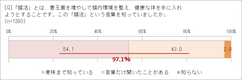 「腸活」という言葉自体の認知度は97・1%と非常に高く、広く浸透していることがわかりました。ところが、自分の腸内環境についてき いてみると、「腸内環境に自信がある」人は32.5%なのに対し、「自信がない」人は67.5%と倍以上。思いのほか、腸内環境に自信がない人が多いことも判明しました。また、実際に腸活をしたことがある人は34.9%で3割ほどですが、腸内環境を整えたいと思っている人は93.3%に上り、腸活への高い関心が読み取れました。
