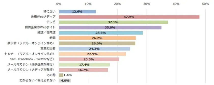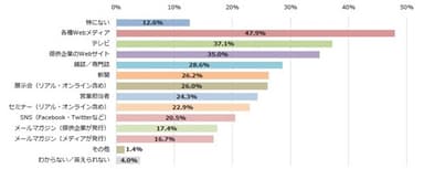 「提供企業のWebサイト」が最上位、次いで「展示会(リアル・オンライン含め)」