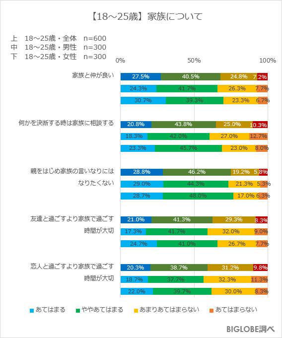 一方、「親をはじめ家族の言いなりにはなりたくない」については男女とも7割以上が「あてはまる」「ややあてはまる」と回答した。