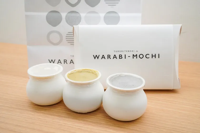 そのほか、カップに入ったわらびもちの上に生クリームをのせ、好みできな粉をかける「クリームわらびもち」(450円)は「プレーン」「ほうじ茶」「黒胡麻」の3種類をご用意しております。