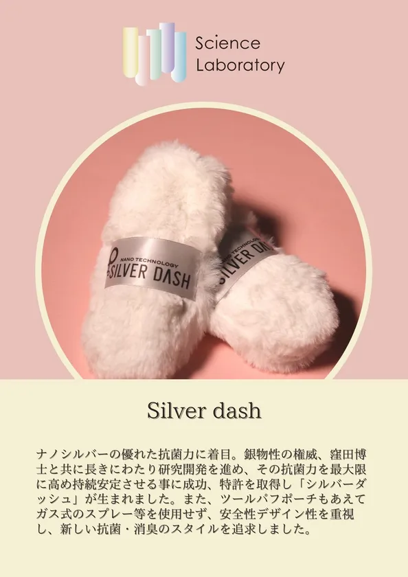 ナノシルバーの優れた抗菌力に着目。銀物性の権威、窪田博士と共に長きにわたり研究開発を進め、その抗菌力を最大限に高め持続安定させる事に成功、特許を取得し「シルバーダッシュ」が生まれました。また、ツールパフポーチもあえてガス式のスプレー等を使用せず、安全性デザイン性を重視し、新しい抗菌・消臭のスタイルを追求しました。