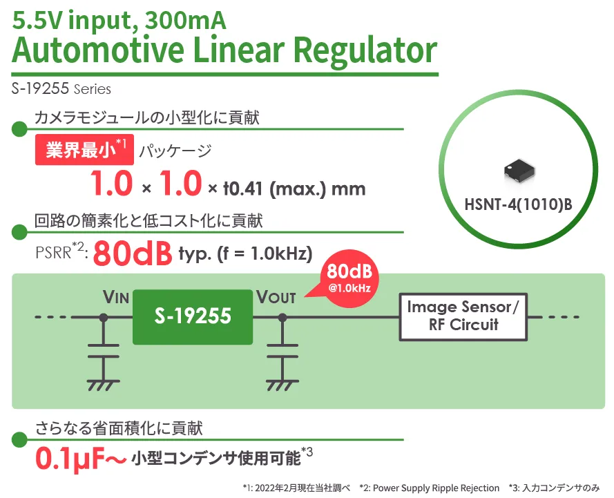 「S-19255シリーズ」は、5.5V動作300mA出力の車載LDOリニアレギュレータとして業界最小パッケージサイズのHSNT-4(1010)Bを採用しました。これによりカメラモジュールなどの小型化に貢献します。