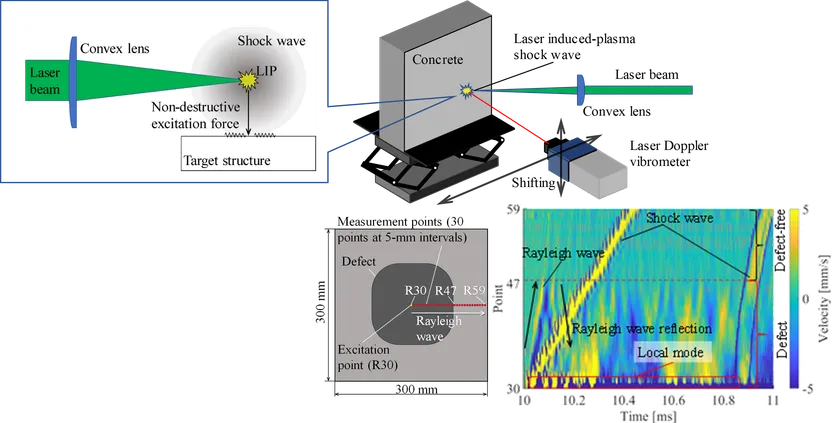 ハンマーを使った打音検査に代わる検査方法として、コンクリート構造物の表面近くに衝撃波を発生させる方法があります。この衝撃波が構造物に振動を与え、その振動を解析することで欠陥を検出することができます。そして、このような検査では、構造物に損傷を与えない衝撃波を発生させる必要があります。そこで期待されているのが、レーザー誘起プラズマ(LIP)衝撃波の発生です。この技術は、パイプから果物の表面まで、さまざまな構造物の欠陥を検出するために使用されています。この方法では、コンクリート表面近くにレーザーでプラズマを形成します。そして、このプラズマにより衝撃波を生成します。この衝撃波はハンマーで叩くことと同じ役割を果たします。