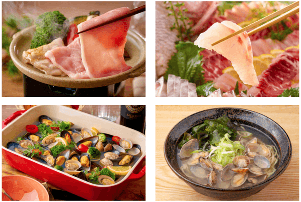 ◼️ 上段右:鯛のお造り。江戸時代、江戸への輸送が容易な距離だったこと、また良質な水や米を生み出す自然豊かな土地であったことから、千葉にも沢山の酒蔵があります。地元、君津・富津の6酒蔵の銘柄をご用意しています。スタッフお薦めの「かずさぽんぽこ囃子」(748円)とご一緒に。