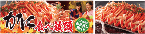 秋の伊香保はボリュームたっぷりの肉料理によるおもてなしを予定していましたが、お客様の熱いご要望に応えて、「かに食べ放題」もお楽しみいただけることになりました。かに&各種肉料理の豪華なバイキングで食欲の秋を満喫しませんか?