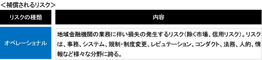 ● 本保険では、地域金融機関の業務遂行において顕在化したオペリスクに伴い、顧客等の第三者に経済損失が発生し、損害賠償請求を提起された場合に当該地域金融機関が負担する法律上の損害賠償金や争訟費用を保険金としてお支払いします。