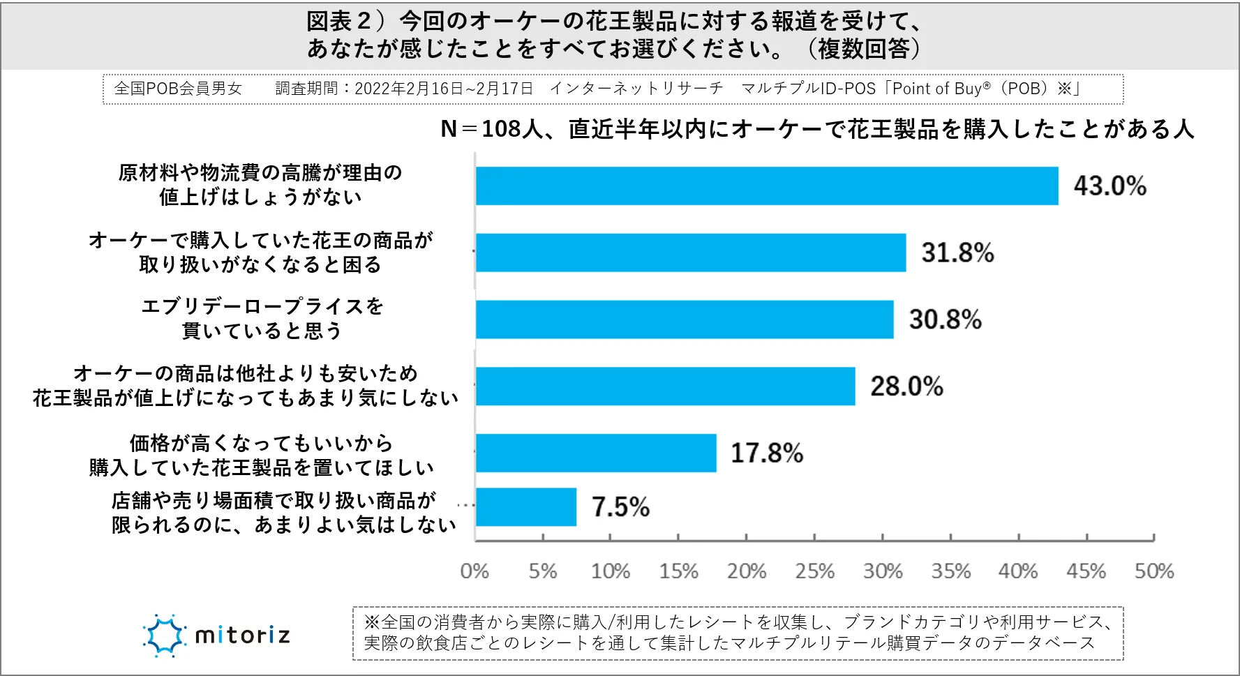・直近半年以内にオーケーで花王製品の購入経験がある108人に、この報道を受けてどう感じたか尋ねると、「原材料や物流費の高騰による値上げはしょうがないこと」(43.0%)が最多回答で、「いつもかっていた花王製品がオーケーで扱いがなくなると困る」(31.8%)、「エブリデーロープライスを貫いていると思う」(30.8%)を挙げる割合も多く、「オーケーの商品は他社よりも安いため、花王製品が値上げになってもあまり気にしない」(28.0%)、「価格が高くなってもいいからいつも買っていた花王製品を置いてほしい」(17.8%)顧客としての要望も挙がった。