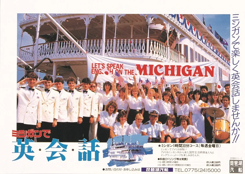 昭和40年代以降のマイカー時代到来や、琵琶湖総合開発に対応し、1882年(昭和57年)、観光の原点といえる「非日常」を最大限に演出した観光船「外輪船ミシガン」を建造しました。ミシガンでは、当時はまだ身近でなかった外国をびわ湖に再現すべく、アメリカの蒸気船を外観にベルサイユ宮殿風の豪華な内装を施したほか、ミシガン州から来日した国際交流研修生による接遇サービスを併せて実施しました(※下記ご参照/ミシガン国際交流研修プログラム)。結果、これまでに類を見ない観光船として、就航より40年、延べ800万人以上の方にご乗船いただき、今現在も当社主力船として活躍しております。