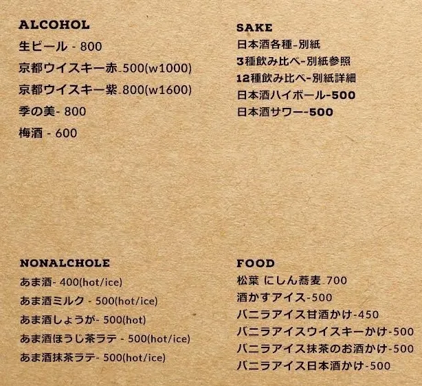 京都の地酒やウイスキー、酒粕アイスなど、お酒やさんならではのメニューで、お客さまにゆったりと京都を感じていただきます。