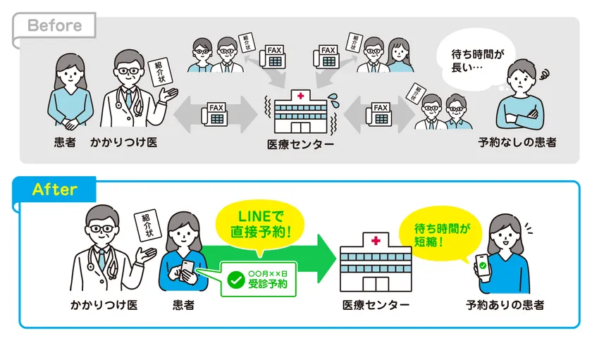 今回のサービスによって、患者にとっては自分の都合に合わせて受診予約を入れることができる上に、予約当日の病院での待ち時間の短縮効果が期待できます。さらに、病院にとっても自ら予約する患者が増えることで、従来のFAXでの予約対応時間の削減だけでなく、事前予約なしでの訪問による突発的な診察対応の減少など、病院運営の効率化に繋がることが期待されます。