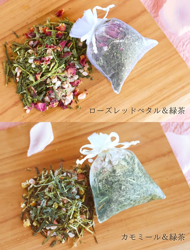 ローズレッドペタル&緑茶と、カモミール&緑茶の2種類のバスソルトを詰め合わせました。