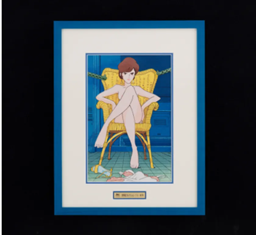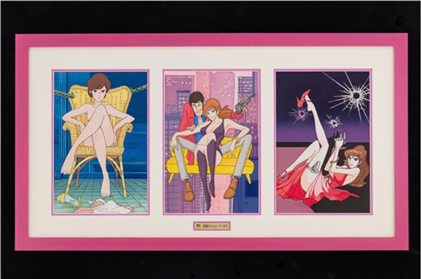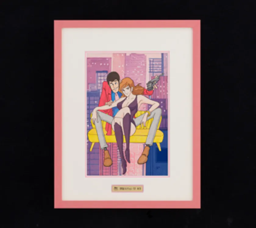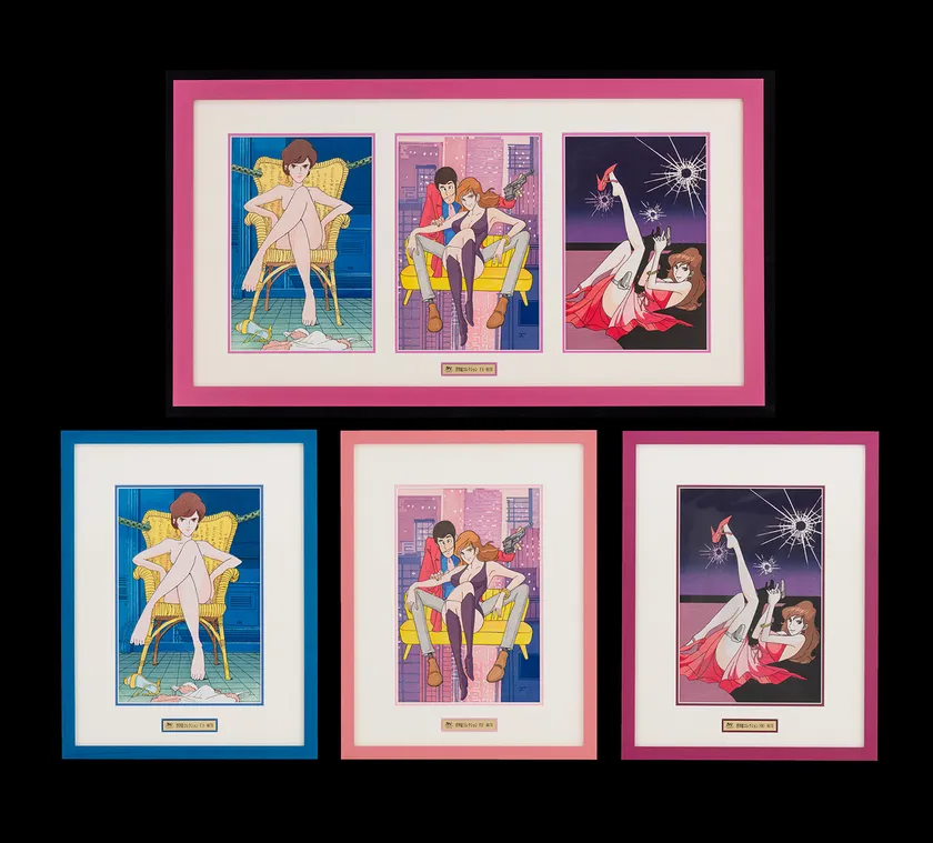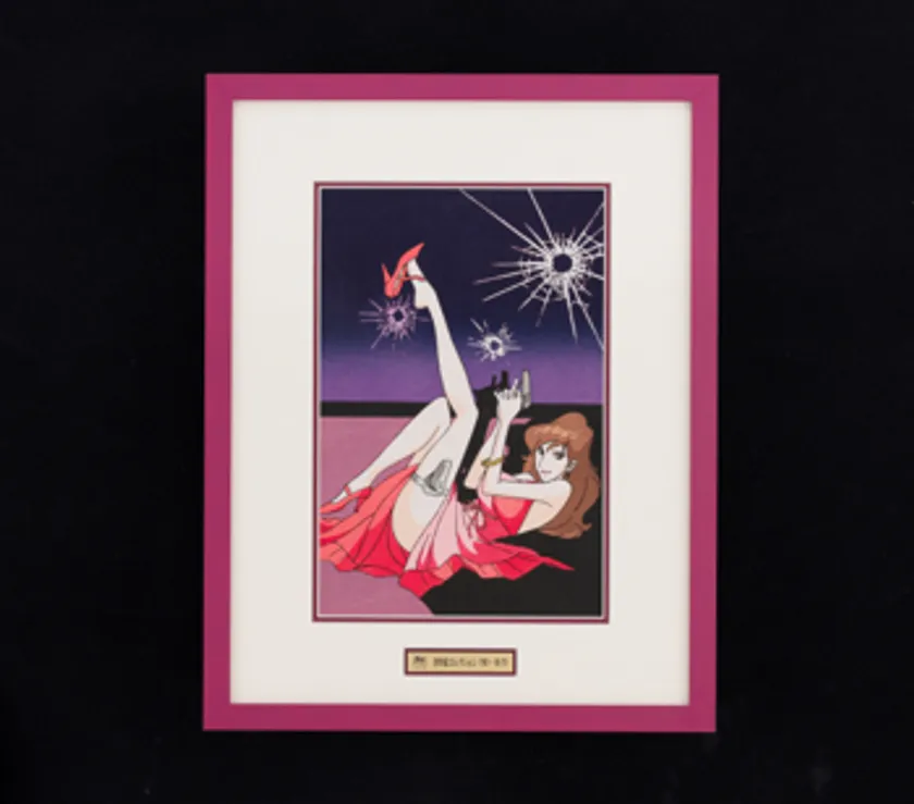 今回は峰不二子にフォーカスし、3枚の浮世絵を制作しました。ルパンと不二子が寄り添って座っている1枚。ルパンと不二子の関係性が1枚に表現されています。またルパン三世 PART2第145話「死の翼アルバトロス」から不二子が取り調べされる印象的なシーン。銃を向けられながらも足を組んで堂々としている不二子を表しています。さらに太腿に覗かせるホルスターがセクシーさを感じさせる不二子、脱げかかったハイヒールもワンポイントです。