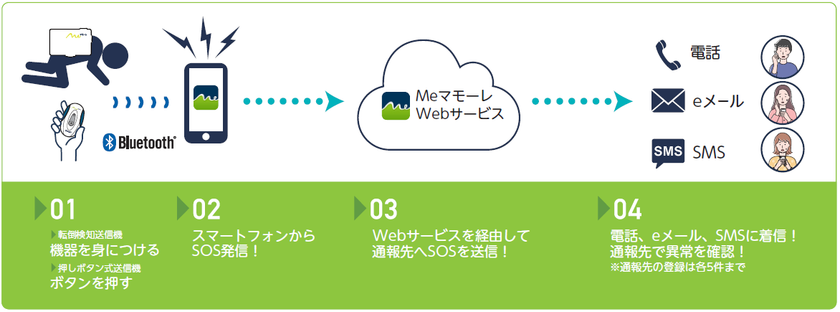 ・対象端末とBluetooth対応のスマートフォン、そしてクラウドサービスが連携をして、緊急通報を行うシステムです。