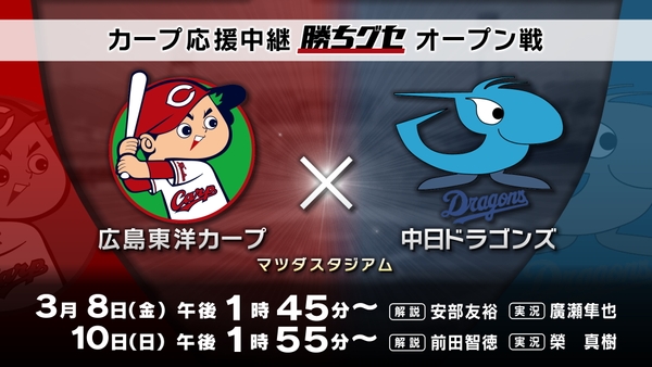 広島ホームテレビ(HOME:本社・広島市中区)は、3月8日(金)午後1時45分から、3月10日(日)午後1時55分から、カープ応援中継”勝ちグセ”オープン戦を放送します。広島東洋カープが、本拠地マツダスタジアムで中日ドラゴンズを迎え撃ちます。