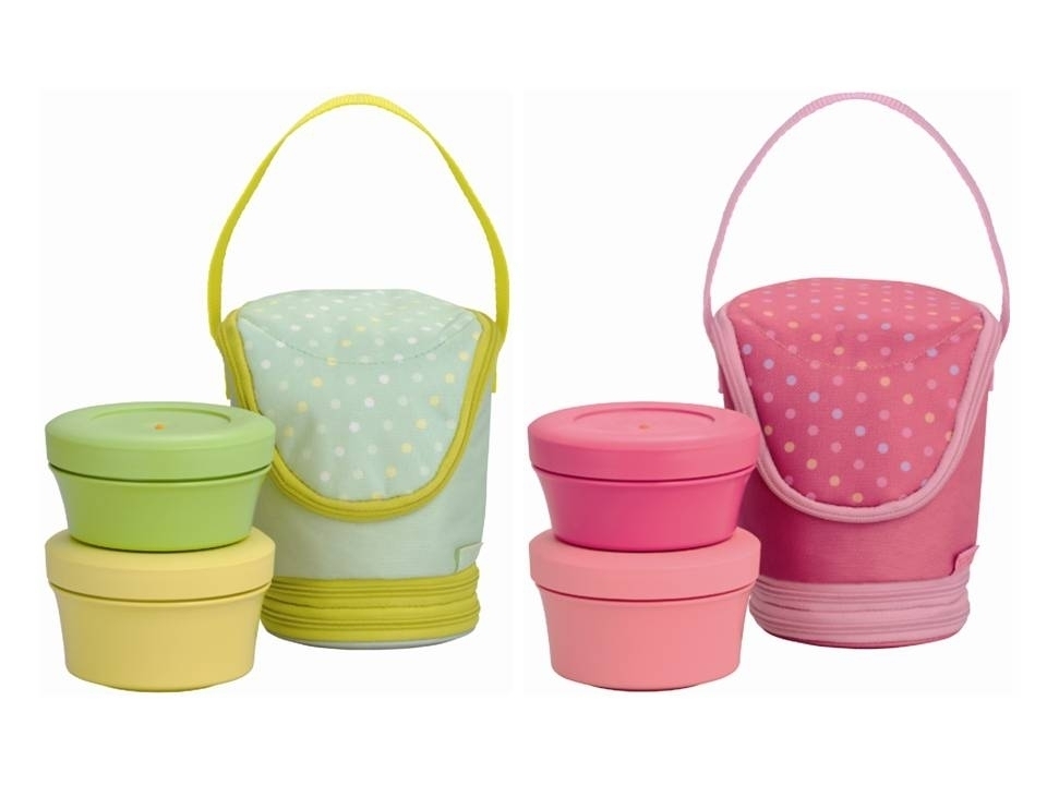 このフードコンテナーをさらに楽しく、さらに便利に使いこなしていただくために、フードコンテナーとセットで使える「フレッシュフードコンテナー」を開発しました。容器は、電子レンジでも使用可能な大(300ml)と小(245ml)の2個セット。断熱構造の保冷バッグは、3段階に高さを調節できるので、真空断熱フードコンテナーを一緒に入れることもできます。