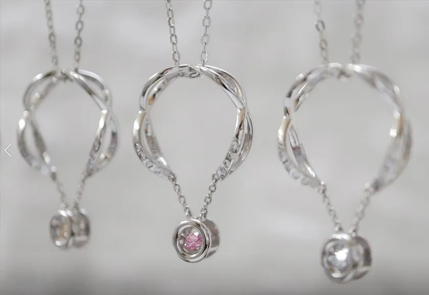 本ジュエリーはダンシングストーン(株式会社クロスフォー特許)を使用したジュエリーで、ネックレスがブレスレットやアンクレットに、ペンダントトップはリングにもなります。また、180度回転させて使用するとデザインが変わるなど、ダンシングストーンは今までにない当店オリジナルデザインです。