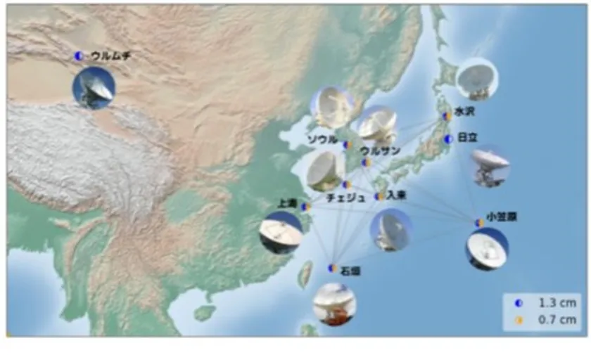 今回の観測で用いた東アジアVLBIネットワークの電波望遠鏡と観測周波帯。