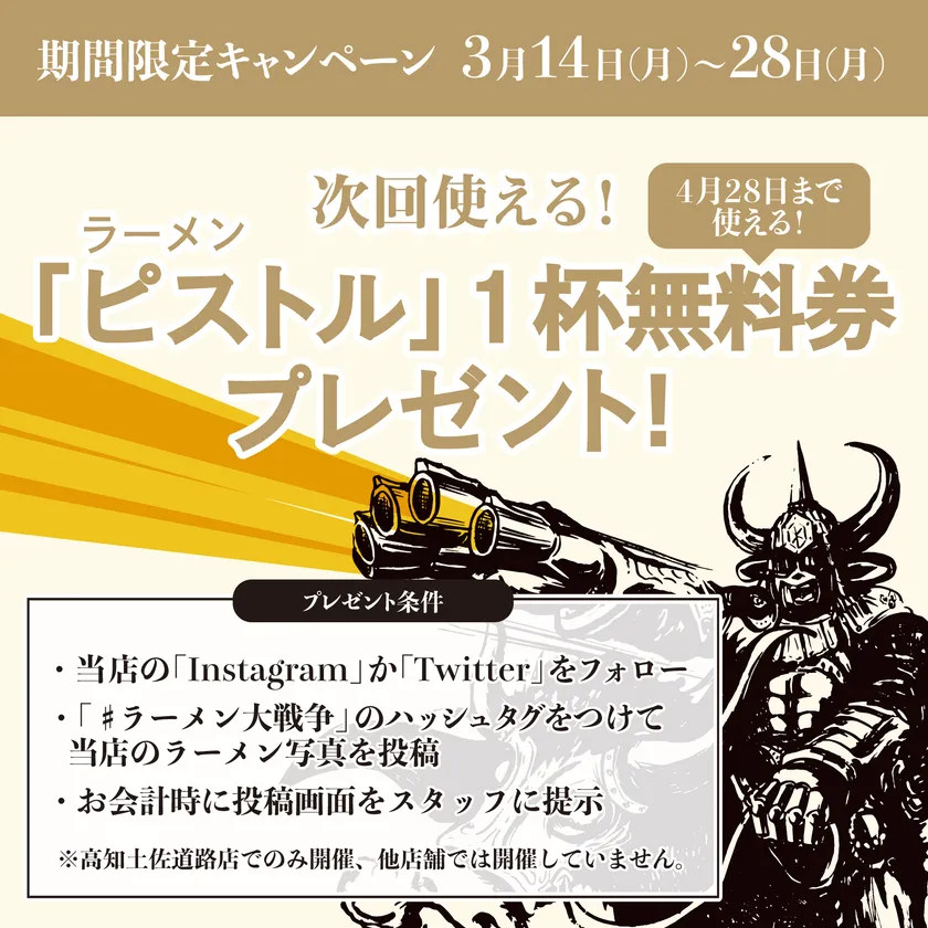 高知土佐道路店のTwitterもしくはInstagramをフォローの上、『#ラーメン大戦争』のタグを付けて投稿いただくと、「次回使えるラーメン・ピストル1杯無料券」をお渡しします。