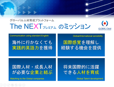 英語学習を起点として世界で活躍するための人材サービスを提供している株式会社グローバルクリック(東京都港区、代表取締役:薗田 浩樹)は、海外渡航が厳しい状況の続く中でも国際感覚を磨き、常に自分の成長を意識して将来世界で活躍する企業人材を目指す学生を集めた選抜式のグローバル人材育成型の就活サポートプラットフォーム『The NEXTプレミアム』を2022年3月22日に立ち上げました。
