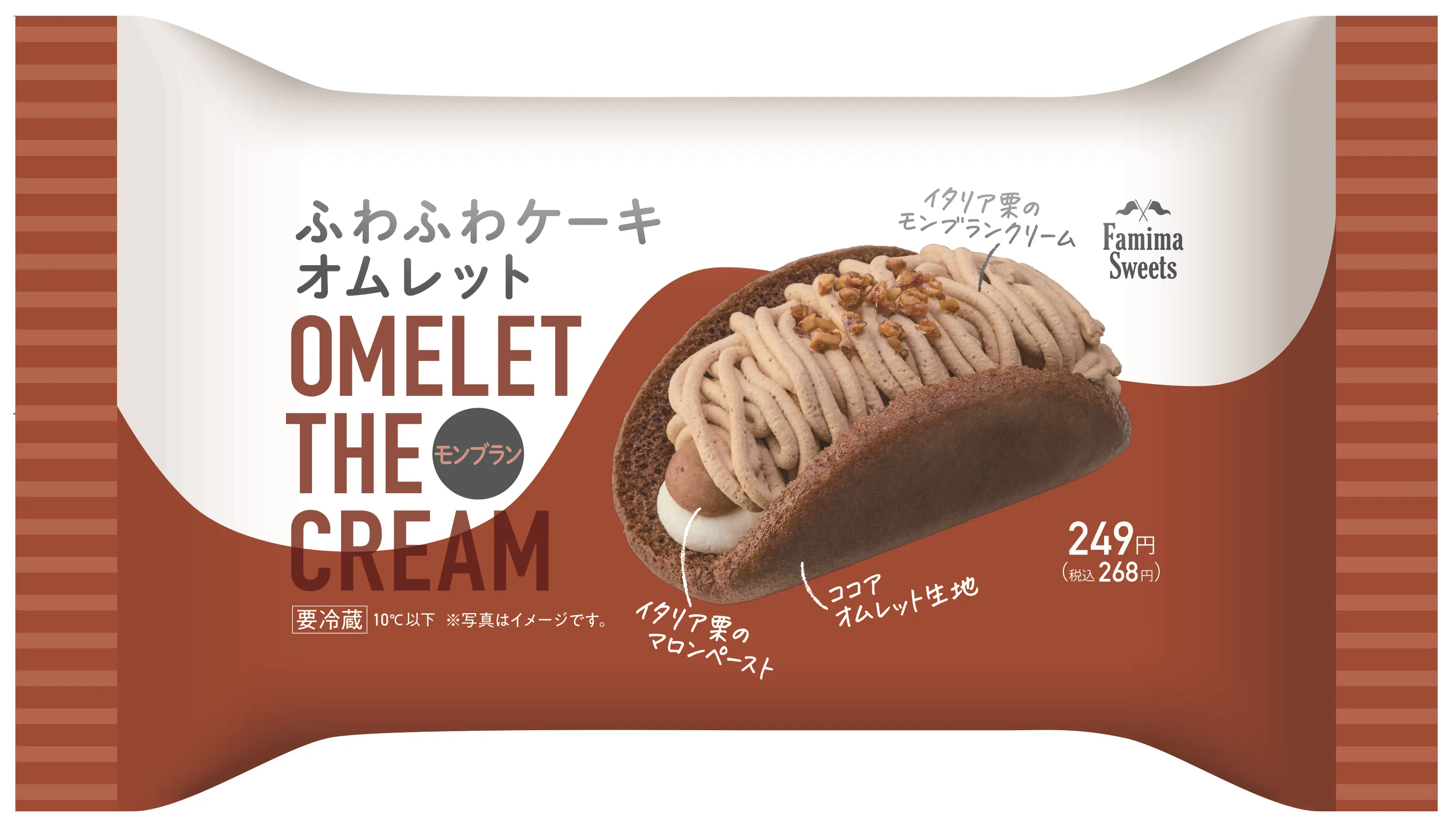 【内容】専門店品質の口どけ・味わいにこだわった、ファミマの「ふわふわケーキオムレット」シリーズの第3弾です。ふわっふわで口どけのよいココアオムレット生地で、イタリア栗のマロンペースト、モンブランクリームとホイップクリームを贅沢に包み込んだスイーツです。