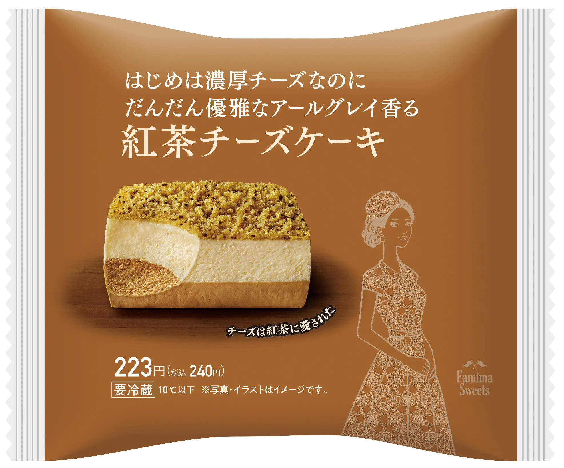 【内容】紅茶とクリームチーズをブレンドして焼き上げた口どけなめらかなベイクドチーズケーキと、北海道産マスカルポーネチーズを使用したレアチーズムースの2層仕立てのケーキに、クラム状にした紅茶スポンジをのせました。