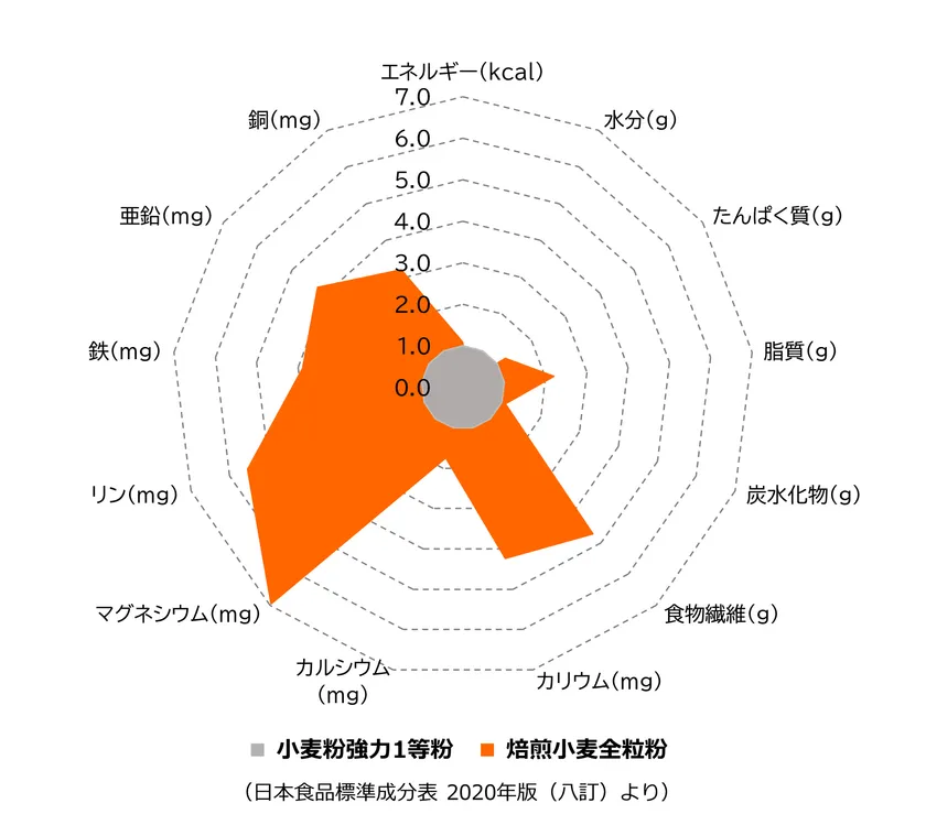 穀物を粒のまま焙煎・粉砕しているため、栄養をまるごと摂ることができます。焙煎小麦全粒粉の場合、強力粉と比較すると、食物繊維をはじめ、カリウムやマグネシウムなどのミネラルも多く含まれています。