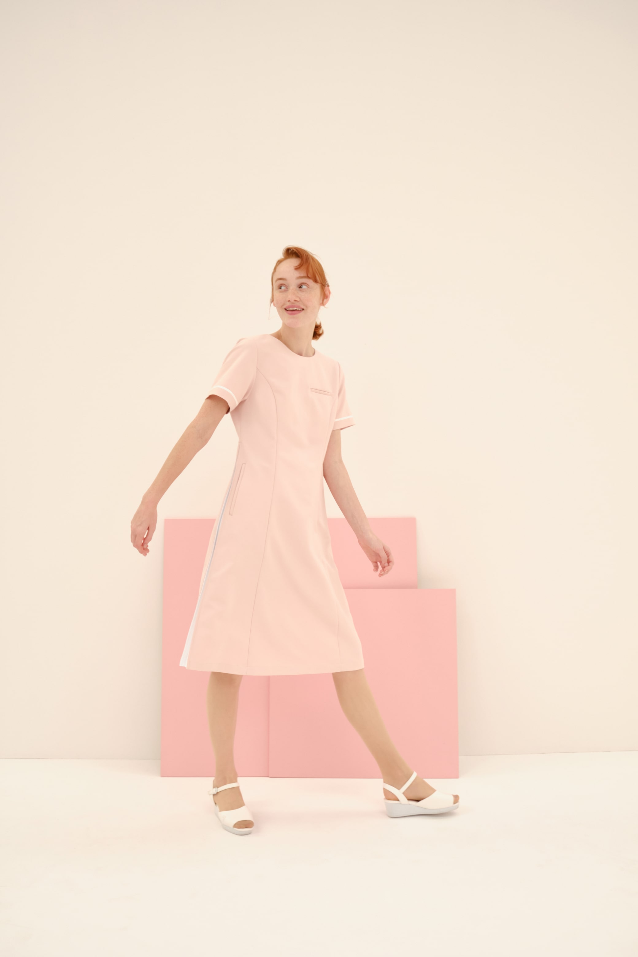 前あきジップで着脱がスムースなスクラブトップス、腰まで隠れる着丈で安心のチュニック、ウエストのシルエット美も完璧なワンピースと、それぞれの機能性や優れた仕立ても、このコラボレーションならではのアイテムです。