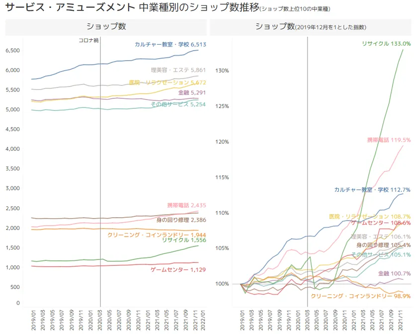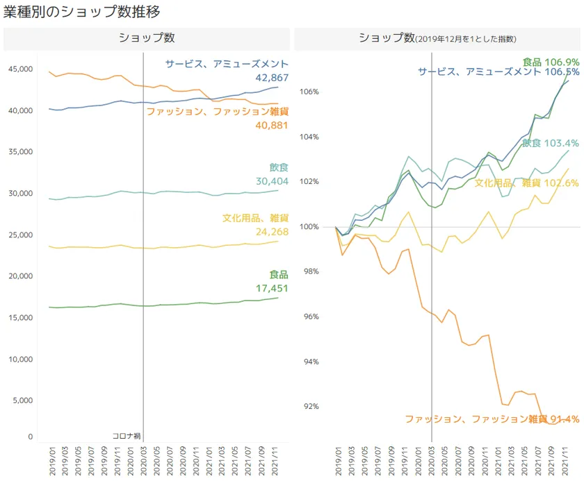 コロナ禍で増えた業種・減った業種は? 全国ショッピングセンターの業種別ショップ数データを発表 ~出店・退店データからトレンドを分析できる クラウドサービス「SC FORCE」~