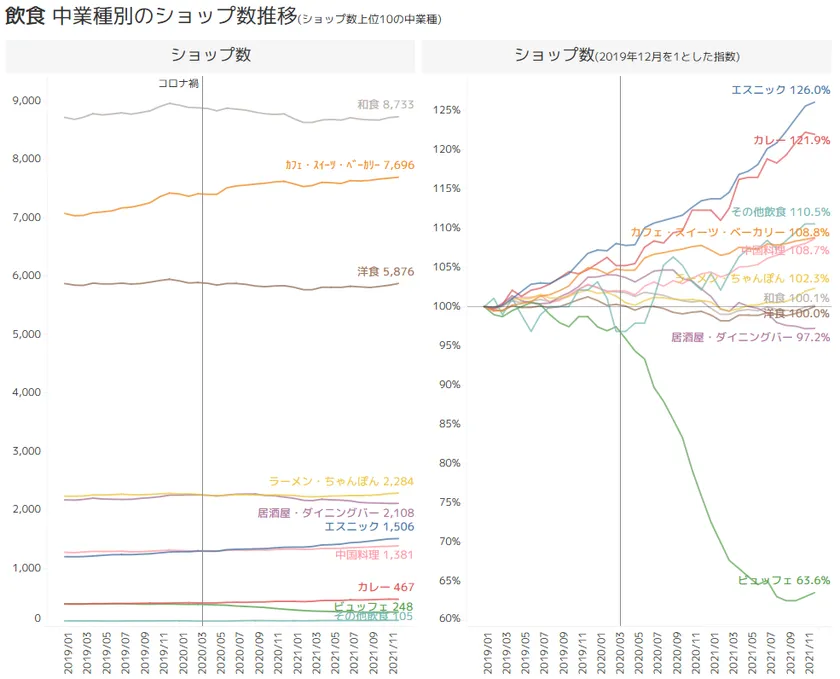 コロナ禍を期に、ビュッフェが大きく減少しています。2020年3月に厚生労働省が発表した文章で、クラスターが発生しやすい場所に「ビュッフェスタイルの会食」が入っており、ビュッフェが敬遠されている可能性があります。すべての業種が減っているわけではなく、しゃぶしゃぶの「しゃぶしゃぶ美山」、「しゃぶ葉」はショップ数を維持しています。しゃぶ葉では2021年10月に配膳ロボットを導入し、店員と客の接触を減らすなど工夫を凝らしています。