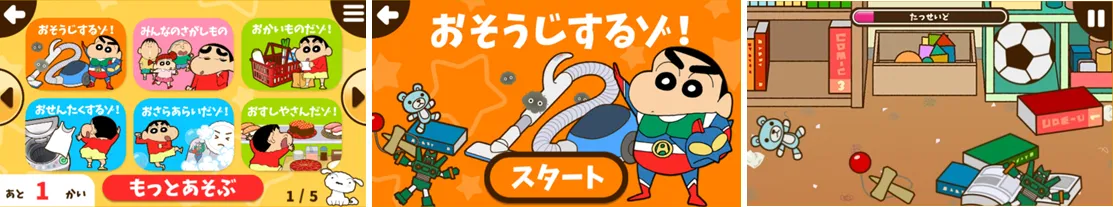 日本国内では2017年よりサービスを開始した、お子さまからの絶大な人気を誇る「クレヨンしんちゃん」を起用したお手伝い支援アプリです。キャラクターがお子さまに寄り添い、実生活で役に立つ疑似体験を通じて「本当のお手伝い」に繋がる大切な機会を提供することをコンセプトに多種多様な「お手伝いコンテンツ」を提供しております。幼児期に大切な社会性や自主性を育み、お手伝いを達成した記憶をお子さまの自信につなげることを実現いたします。