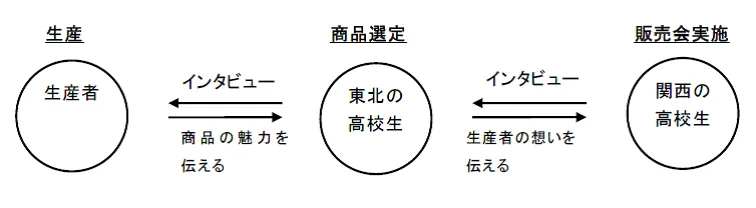 関西の高校生と宮城、福島、岩手の高校生がタッグを組み、参加総勢約50名が現地生産者の想いを届ける物販コーナーにて、東北ならではの約35種類の美味が登場します。